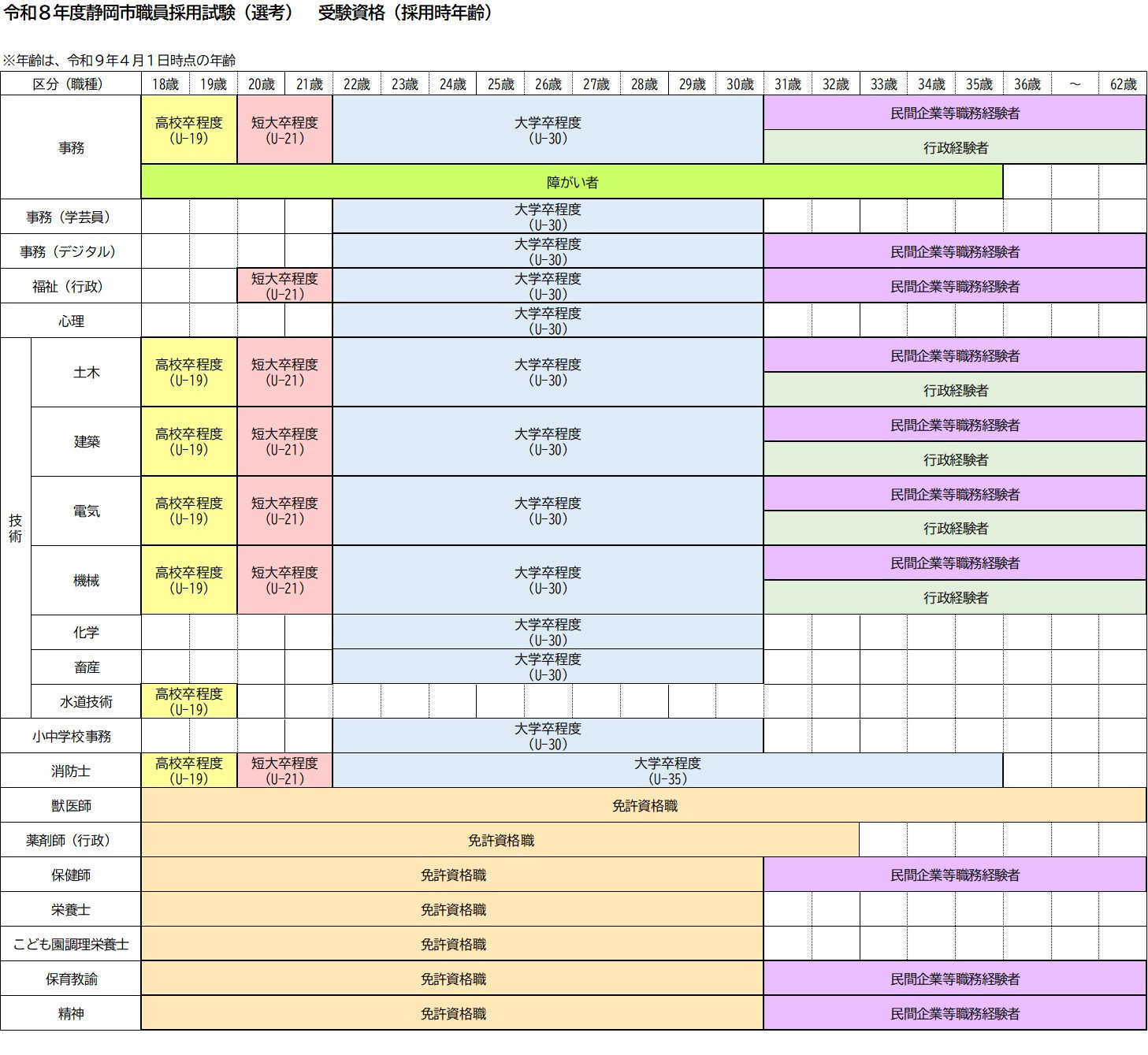 令和8年度静岡市職員採用試験(選考)の試験区分及び受験資格