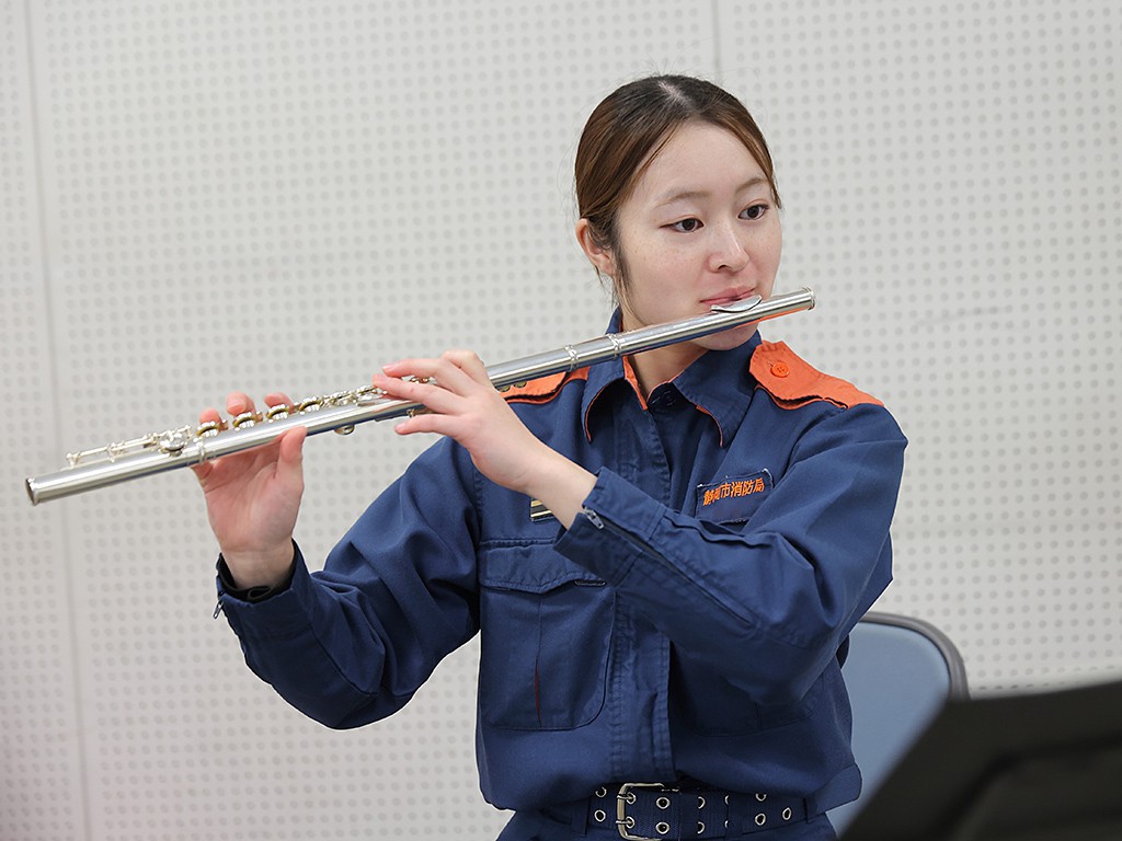 私は、消防士になるまで楽器経験がほとんどありませんでしたが、消防音楽隊の定期演奏会を観覧し、自分も音楽隊の一員として市民に音楽を届け、笑顔にしたいと思ったことがきっかけで消防音楽隊として活動することになりました。フルートを担当し、基礎から練習を重ねて演奏技術の習得に努めています。演奏できるようになった曲をイベントで披露し、拍手をいただけたときには大きな達成感があり、今後の励みになっています。市民から直接「ありがとう」や「楽しかった」と言っていただけることは、消防音楽隊として活動する魅力の一つです。