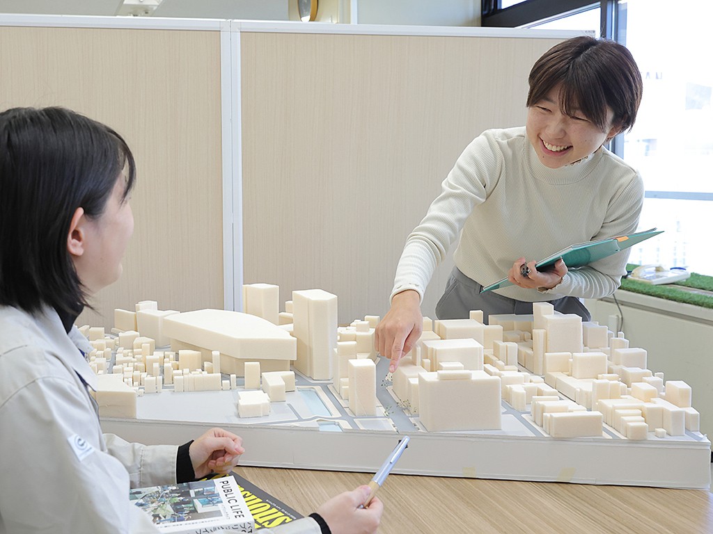 まちづくりは建築・街路・交通・緑・商業など多くの分野が一体となって進めていかなければなりません。そのため、庁内の様々な部署・職種や、地域の様々な立場の方と話す機会が多いです。それぞれ立場が異なる中で、建築安全推進課で学んだ法律の知識など自分が建築職として分かること、そして、建築だけにとらわれず分野横断的にまちのことを考えて意見を出すということを意識しています。