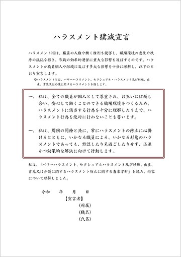 静岡市では、職員一人一人がハラスメント撲滅に向けて行動する決意を明らかにするため、 全職員による「ハラスメント撲滅宣言」を実施しています。全ての職員がハラスメントに 関する正しい知識を持ち、ハラスメント行為を絶対にしない、させない、見過ごさないとい う意識を再認識し、安心して働ける健全な環境、職場風土の醸成を目指しています。